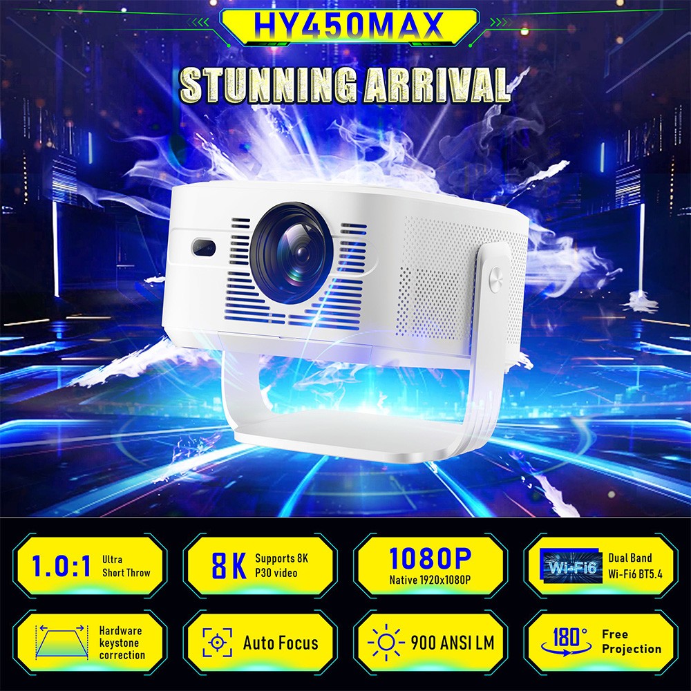 With 900 ANSI lumens, the HY450 Max projector performs excellently even in rooms with ambient light – no need to turn off all lights for movie nights.